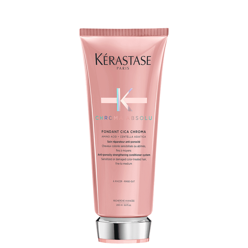 Condicionador para cabelos com coloração, sensibilizados ou danificados para fios fios a médios. Kérastase Chroma Absolu Fondant Cica promove efeito anti-porosidade e um potente fortalecedor.
